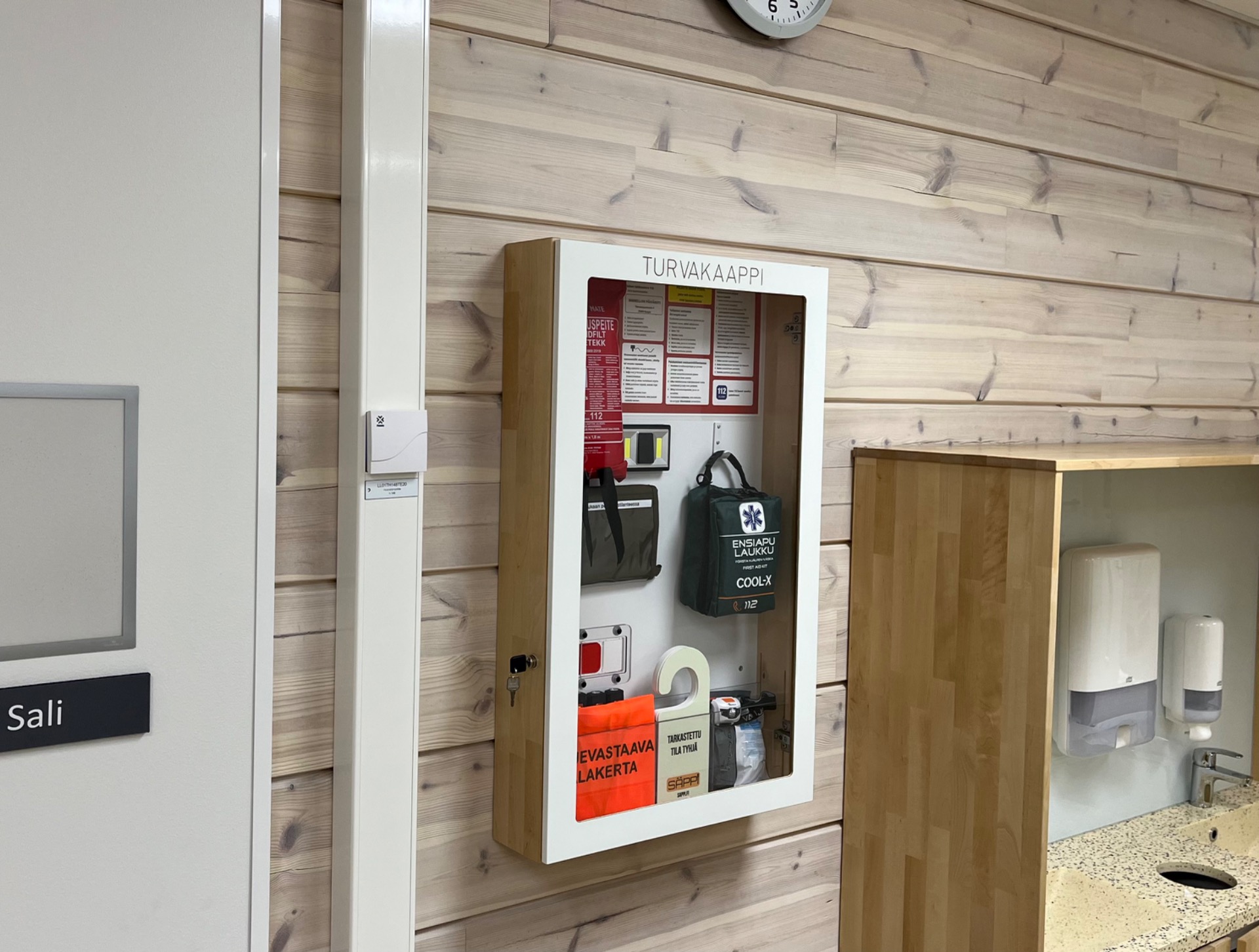 Kuopion uuteen Sinikellon hirsipäiväkotiin on hankittu Turvakaapit (turvapistemalli). Tarvikkeiden asennuksen yhteydessä koulutin talon henkilökunnan välineiden käyttöön ja Turvakaapin pedagogiikkaan. Keskusteltiin myös siitä, kuinka tärkeää on tehdä turvallisuus näkyväksi osaksi arkea - arvoksi.