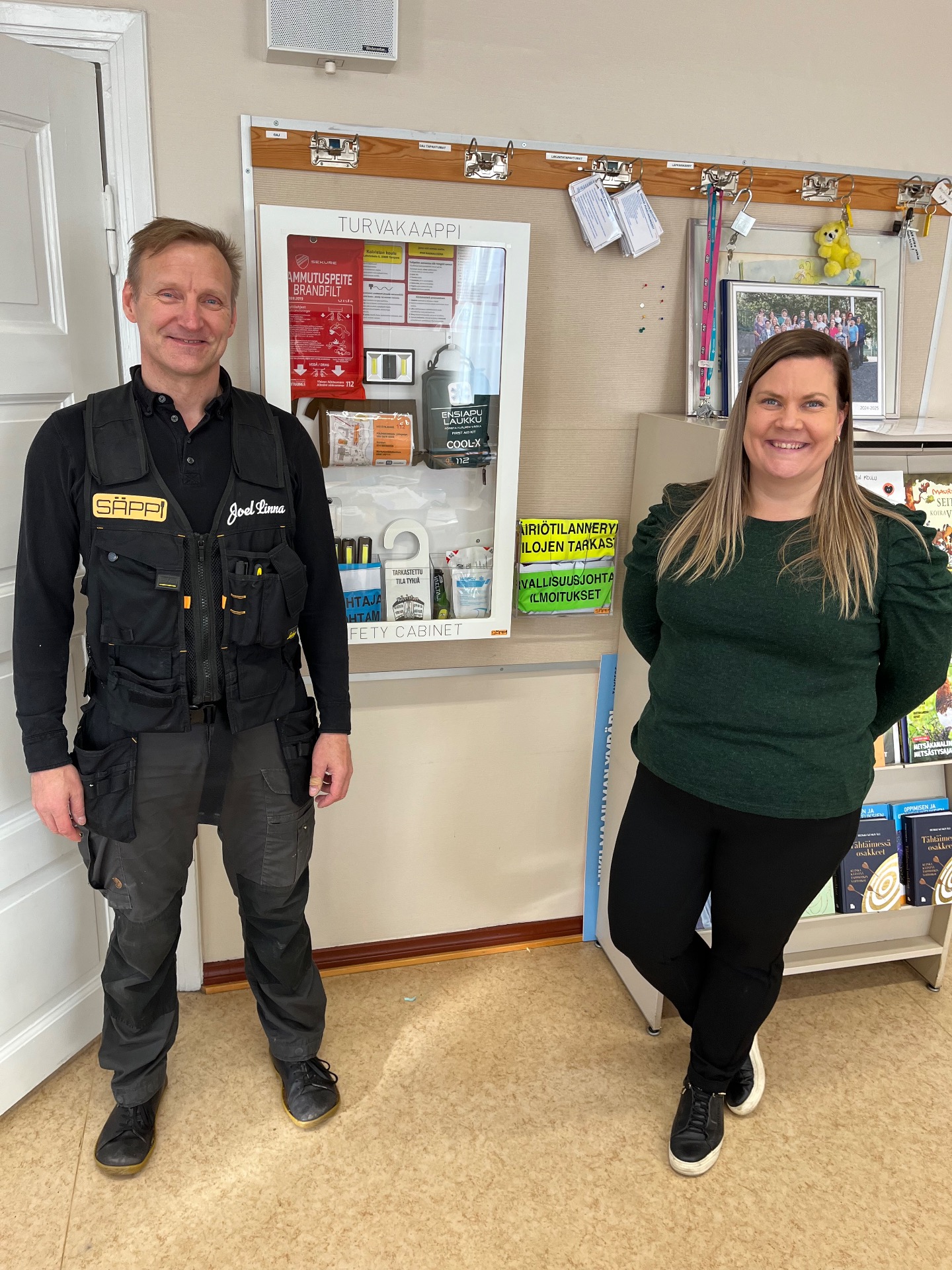 Loistavaa turvallisuustyötä Tampereen kaupunki - City of Tampere. Sain 6.11. nauttia Koiviston koulun turvallisuusmyönteisen henkilökunnan ja joukkojaan upeasti turvallisuuteen luotsaavan rehtori Minna Viskarin (kuvassa kanssani) seurasta ja osaamisesta. Asensin kouluun kaksi turvapistemallin Turvakaappia ja 25 luokkakohtaista kevyempää yksikköä, joista löytyy koulun logolla varustettu jälkiheijastava ovimerkitsin, taskulamppu, ensiaputarvikkeet, kemiallista kylmää ja teippiä tilan tiivistämiseen sisälle suojautumisen varalle.